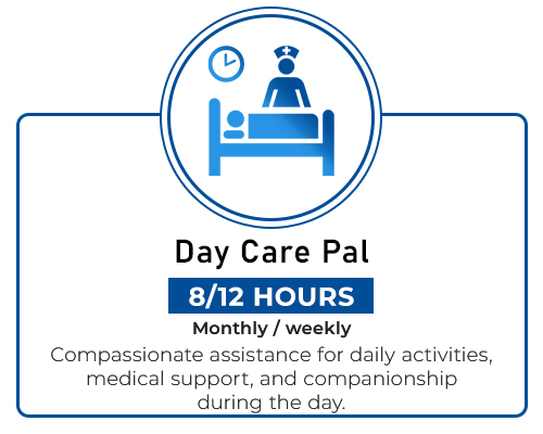 | Day Care Pal | β Daytime help with meals, meds, hygiene βAssistance with daily monitoring and movement |